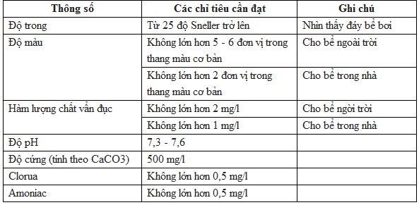 Theo thông tư 02/2011/TT – BVHTTDL của Bộ Văn Hoá Thể Thao và Du Lịch đã quy định tiêu chuẩn nước bể bơi về các điều kiện hoạt động của cơ sở thể thao tổ chức hoạt động bơi lội. Nước bể bơi phải đáp ứng được các chỉ tiêu chất lượng nước sinh hoạt theo quy chuẩn kỹ thuật quốc gia về chất lượng sinh hoạt ( QCVN 02 : 2009/BYT ) ban hành kèm theo thông tư số 05/2009/BYT ngày 17/6/2209 của Bộ trượng Y tế và các chỉ số cụ thể như sau: